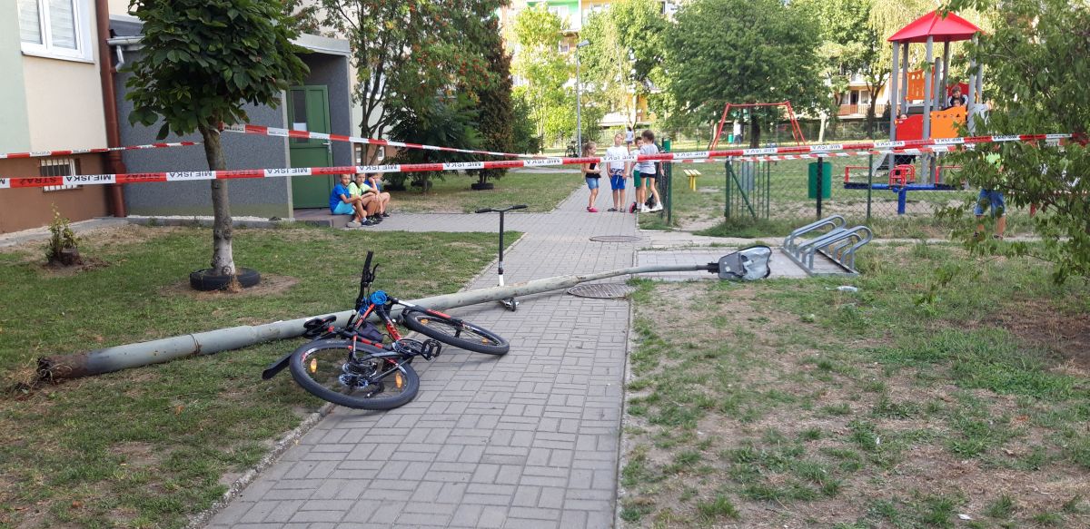 i hulajnogą. Gdy byli przy placu zabaw, między blokami, prawdopodobnie jeden z nich lekko oparł się o latarnię stojącą w pobliżu, a ona przewróciła się na nich. Całkowicie wypadła