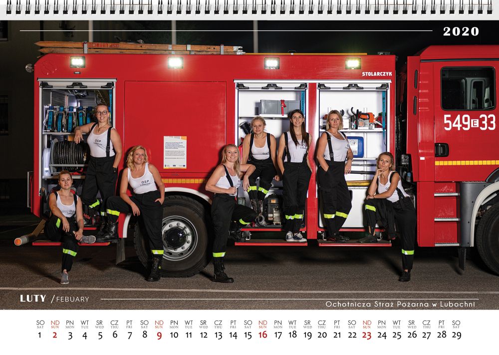Panie na tle strażackich wozów, w remizie, kaskach, z gaśnicami i piłami mechanicznymi, z mokrymi, rozwianymi włosami, w obcisłych białych t-shirtach i strażackich bojówkach... Nierozebrane, ale zmysłowe i pełne pasji. Tak właśnie wyglądają druhny OSP w Lubochni na zdjęciach do kalendarza 2020 wydanego przez tę jednostkę. Rozchodzi się on jak ciepłe bułeczki i nic dziwnego, bo czegoś takiego u nas w powiecie jeszcze nie było, a co więcej, jest także ciekawostką w całym województwie.