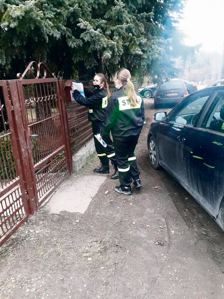 Strażacy roznoszą ulotki z informacjami na temat profilaktyki oraz szczepień przeciw COVID-19.