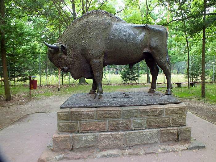 Żubr stoi w Spale już prawie 100 lat. Posąg został sprowadzony w 1928 r. decyzją prezydenta Ignacego Mościckiego i postawiony w pobliżu jego rezydencji (już niestety nieistniejącej). Wcześniej przez cztery lata leżał na dziedzińcu Zamku Królewskiego w Warszawie, po tym jak Rosja sowiecka zwróciła go Polsce na mocy traktatu ryskiego (w ramach rewindykacji zagrabionych pamiątek historycznych).