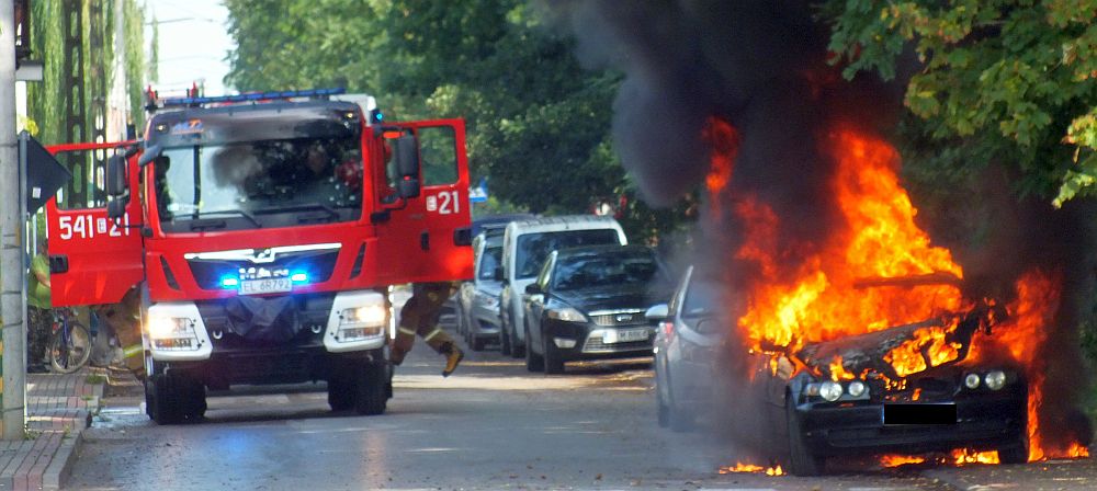 - krzyczeli mieszkańcy ul. Polnej do kierowców przejeżdżających tą ulicą. Płomienie z palącego się samochodu sięgały kilkunastu metrów (do gałęzi drzew w parku Rodego). Na szczęście w porę interweniowali strażacy.