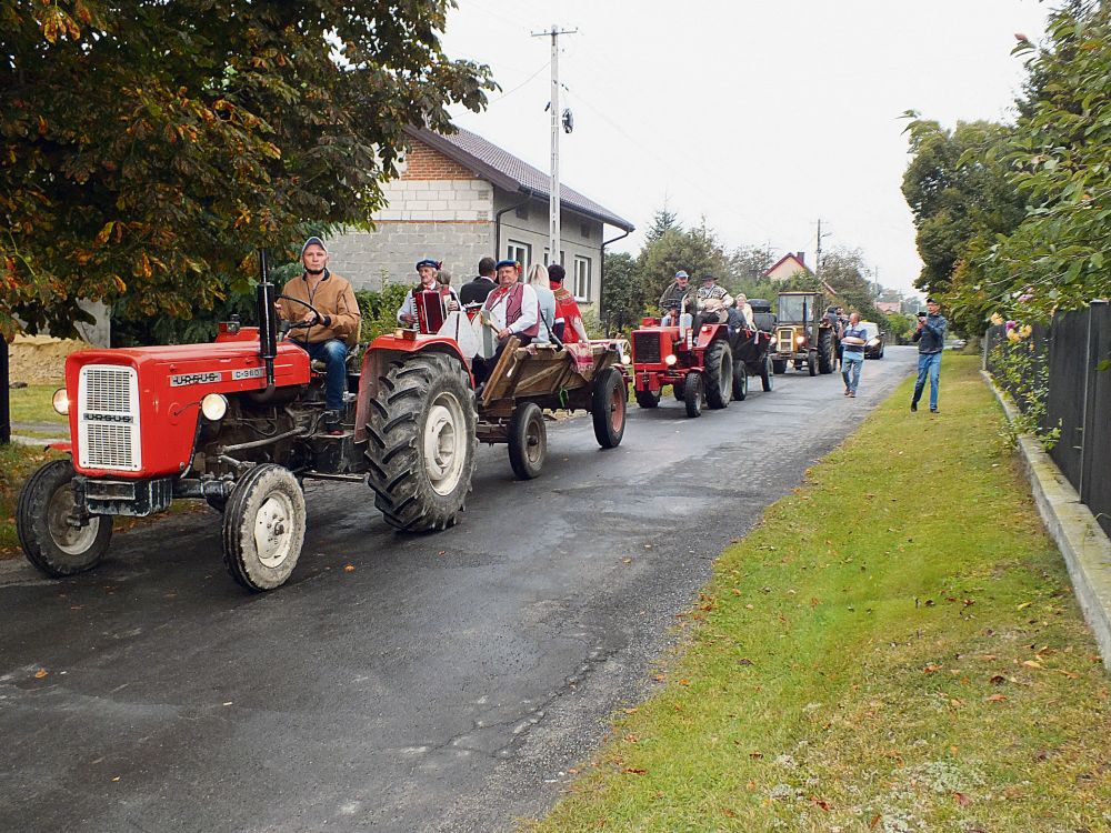Wieczorny konkurs z nagrodami zorganizowany 10 września w świetlicy w Glinie poprzedzono korowodem zabytkowych traktorów wyprodukowanych w XX wieku, z podczepionymi do nich równie starymi wozami konnymi.