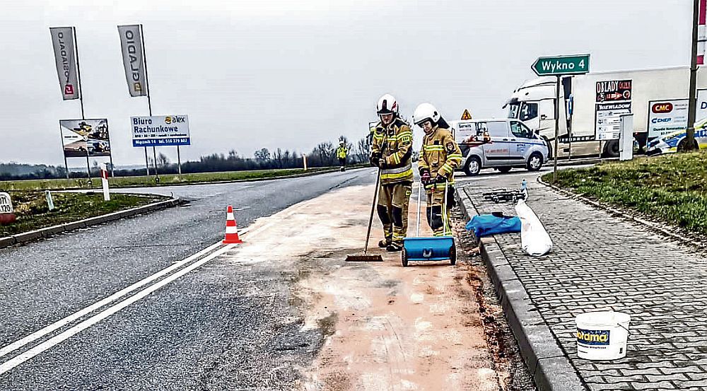 Do zdarzenia doszło około godz. 8.30. Mężczyzna kierujący ciężarówką wpadł w poślizg. Stracił panowanie nad pojazdem i wjechał w barierki energochłonne. Kierowany przez niego pojazd przewrócił się na bok, a ładunek wysypał się na jezdnię.
