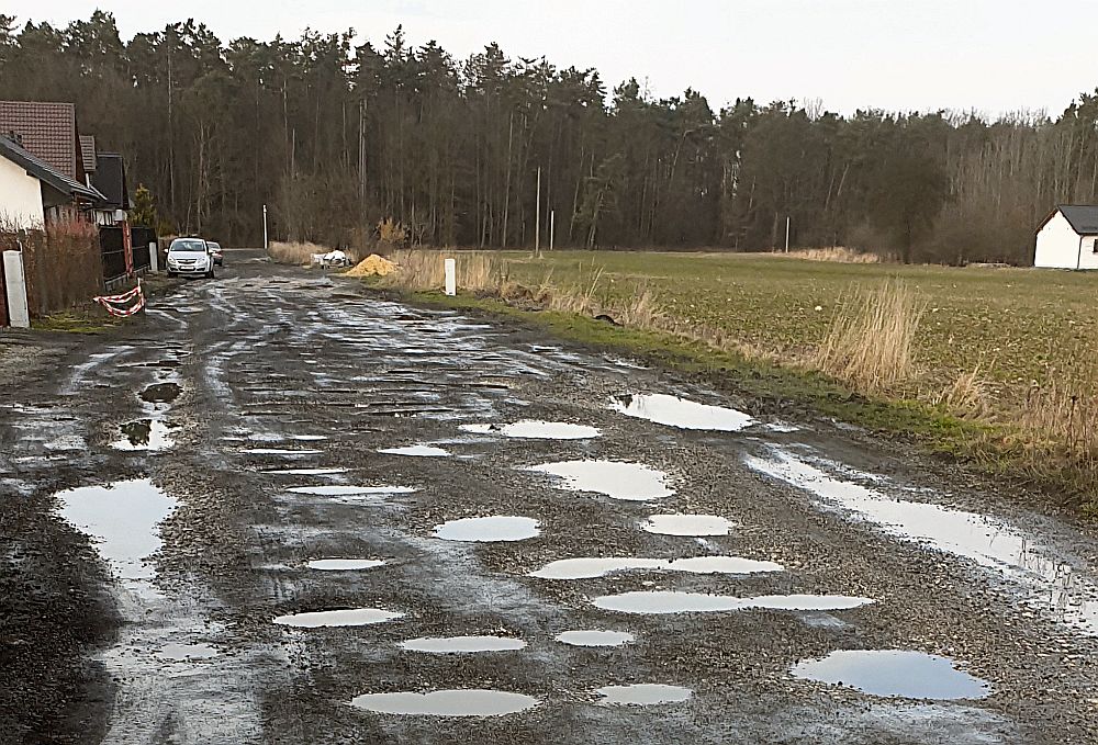 Zatrzymajmy się przy tej pierwszej, przy której jest najwięcej domostw, a droga wzdłuż nich jest w katastrofalnym stanie.