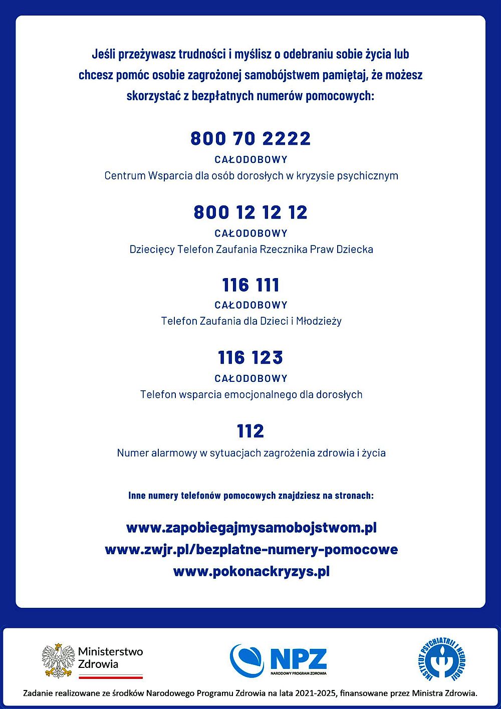 - 116 123 - Poradnia dla Osób Dorosłych w Kryzysie Emocjonalnym (Kryzysowy Telefon Zaufania), bezpłatnie, całą dobę, 7 dni w tygodniu.