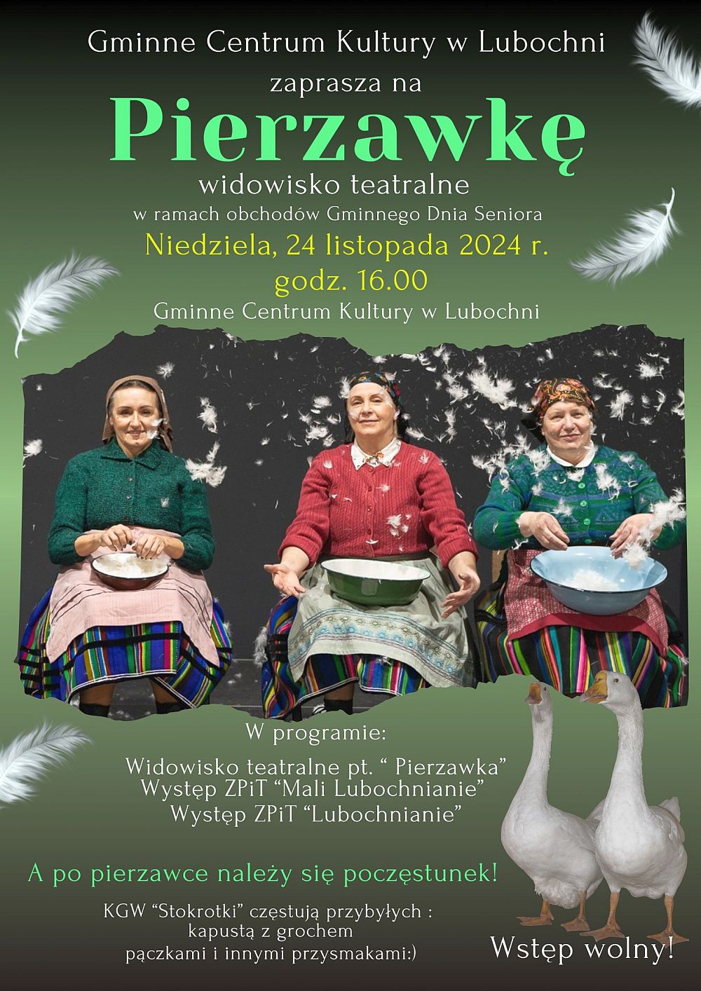 Będzie je można obejrzeć w placówce (jak również wziąć w nim czynny udział) w ramach obchodów Gminnego Dnia Seniora w niedzielę, 24 listopada. W programie są ponadto występy zespołów pieśni i tańca "Mali Lubochnianie" i "Lubochnianie". Po przedstawieniu zaś, jak obyczaj każe, będzie i należny poczęstunek. Do skosztowania czekać mają między innymi kapusta z grochem i pączki oraz inne regionalne przysmaki, których przygotowaniem zajmuje się Koło Gospodyń Wiejskich "Stokrotki". Początek wydarzenia zaplanowany jest na godzinę 16.00. Wstęp wolny. (Fot. plakat wydarzenia)