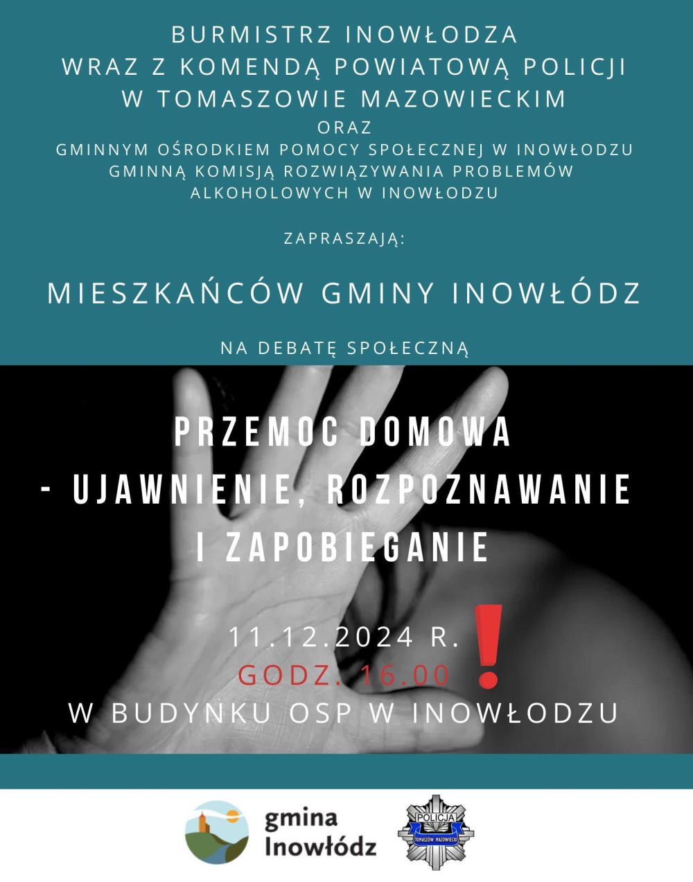 Spotkanie zatytułowane "Przemoc domowa – ujawnienie, rozpoznawanie i zapobieganie" odbędzie się w siedzibie inowłodzkiej Ochotniczej Straży Pożarnej. Początek – po zmianie na życzenie osób zainteresowanych udziałem – przewidziany jest na godzinę 16.00.