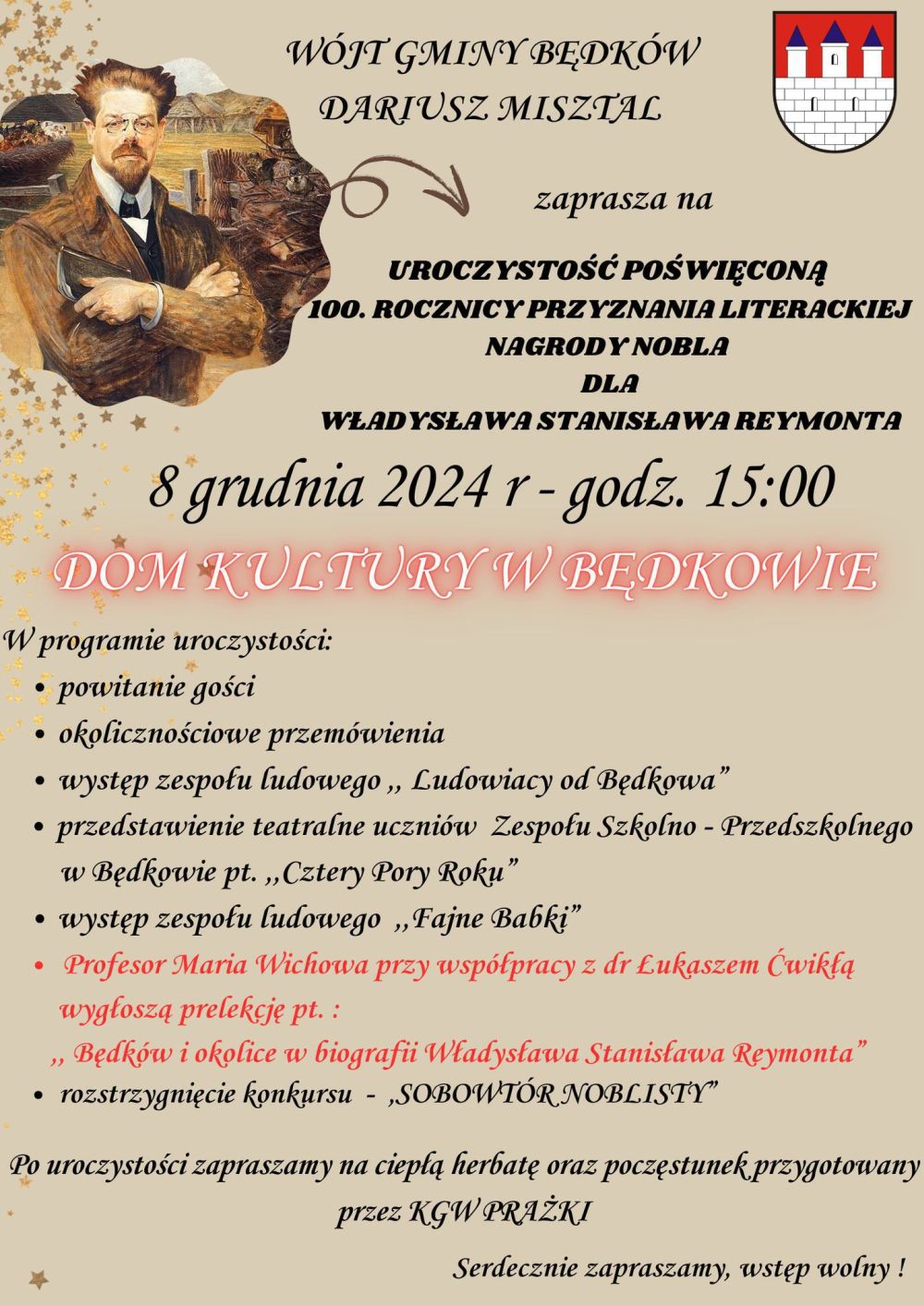 Będą się one odbywać w Domu Kultury w Będkowie od godziny 15.00. Ich główny punkt to prelekcja zatytułowana "Będków i okolice w biografii Władysława Stanisława Reymonta", którą wygłoszą wspólnie naukowcy z Wydziału Filozoficzno-Historycznego Uniwersytetu Łódzkiego: prof. Maria Wichowa – (urodzona w Małczu) oraz dr Łukasz Ćwikła – historyk, adiunkt w Katedrze Historii Średniowiecznej. W programie zaplanowane są również występy: przygotowywane przez uczniów Zespołu Szkolno-Przedszkolnego w Będkowie przedstawienie teatralne pod tytułem "Cztery pory roku" oraz zespołów ludowych "Ludowiacy od Będkowa" i "Fajne Babki".