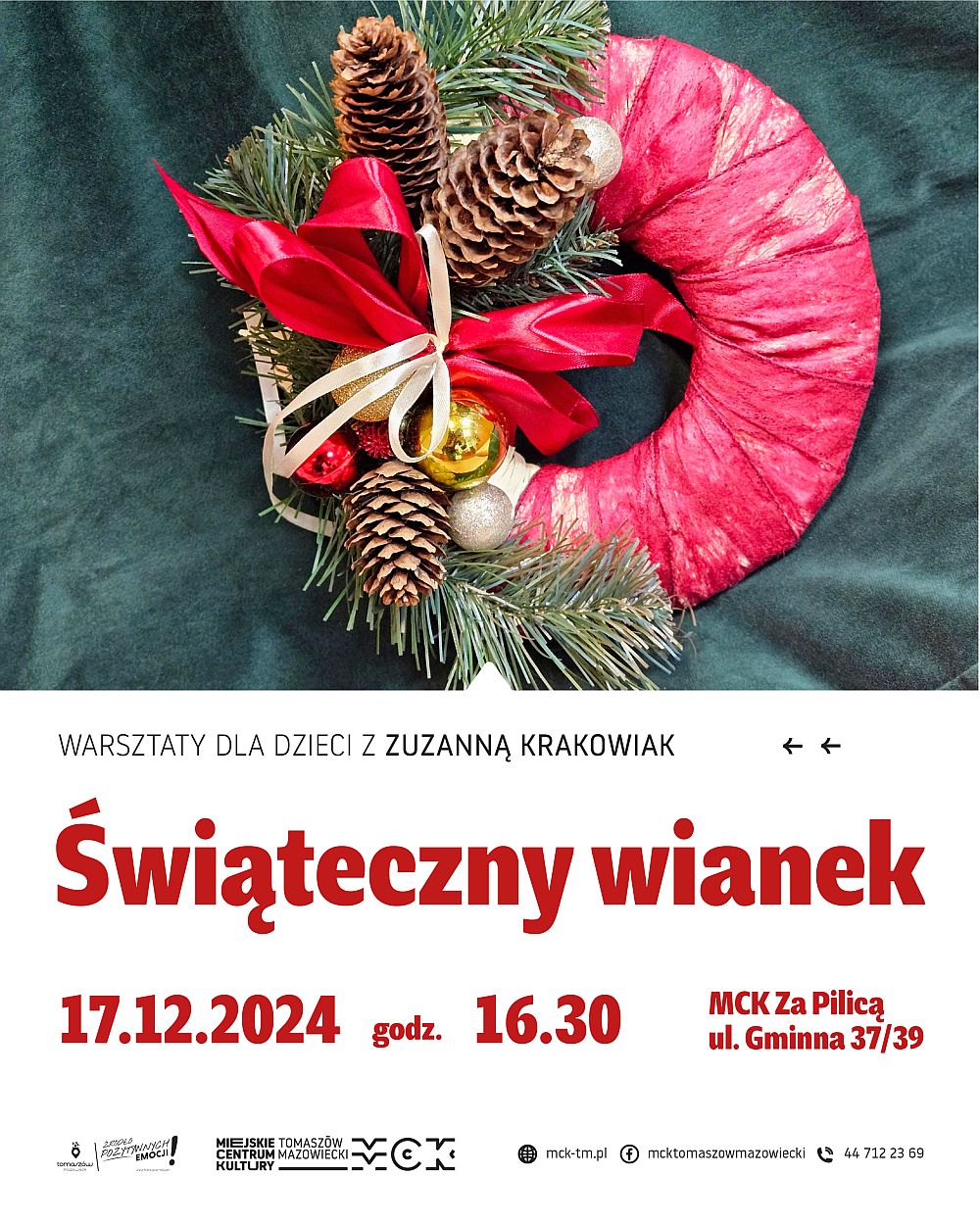 Zajęcia dla dzieci w wieku od 8 do 10 lat we wtorek, 17 grudnia poprowadzi Zuzanna Krakowiak. Pod jej kierunkiem powstawać mają ręcznie robione dekoracje z wykorzystaniem różnego rodzaju materiałów. Początek przewidziany jest na godzinę 16.30. Koszt udziału wynosi 25 złotych od osoby. Zapisy przyjmowane są w sekretariacie MCK przy pl. T. Kościuszki 18 lub za pośrednictwem serwisu Strefazajec.pl. Liczba miejsc jest ograniczona. (Fot. plakat wydarzenia)