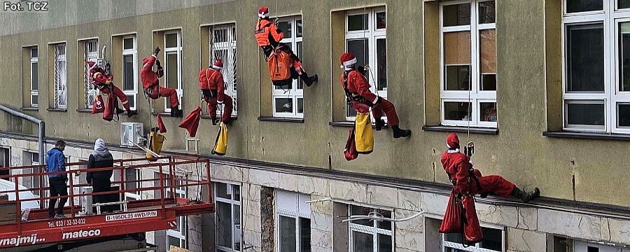 Odwieczne pytanie dzieci, jak wchodzi Święty Mikołaj, przez komin czy może inaczej, zostało w tegoroczne mikołajki w TCZ zaspokojone – panowie w biało-czerwonych strojach, z brodami i workami prezentów zjechali po linach. Najpierw byli na dachu, potem przy oknach, gdzie pacjenci Oddziału Pediatrycznego mogli ich zobaczyć. Radości było mnóstwo.