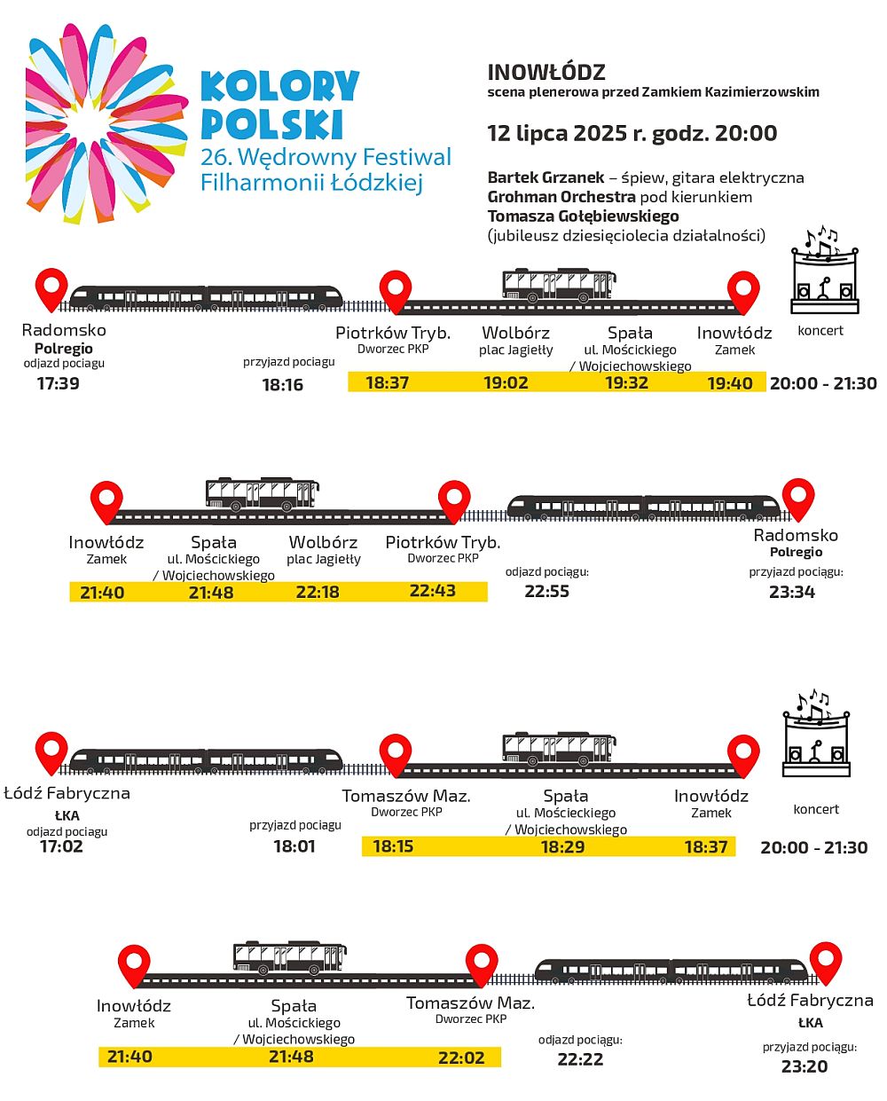 Do i z Inowłodza będzie można bezpłatnie dotrzeć z Tomaszowa i Spały busem Kolejowej Komunikacji Autobusowej Łódzkiej Kolei Aglomeracyjnej. Odjazd z dworca PKP przewidziany jest na godz. 18.15, ze Spały (skrzyżowanie ulic Mościckiego i Wojciechowskiego ) – 18.29, zaś powrót – 21.40. Wymagana jest wcześniejsza rezerwacja miejsca za pośrednictwem strony internetowej Filharmonii Łódzkiej (https://www.filharmonia.lodz.pl).