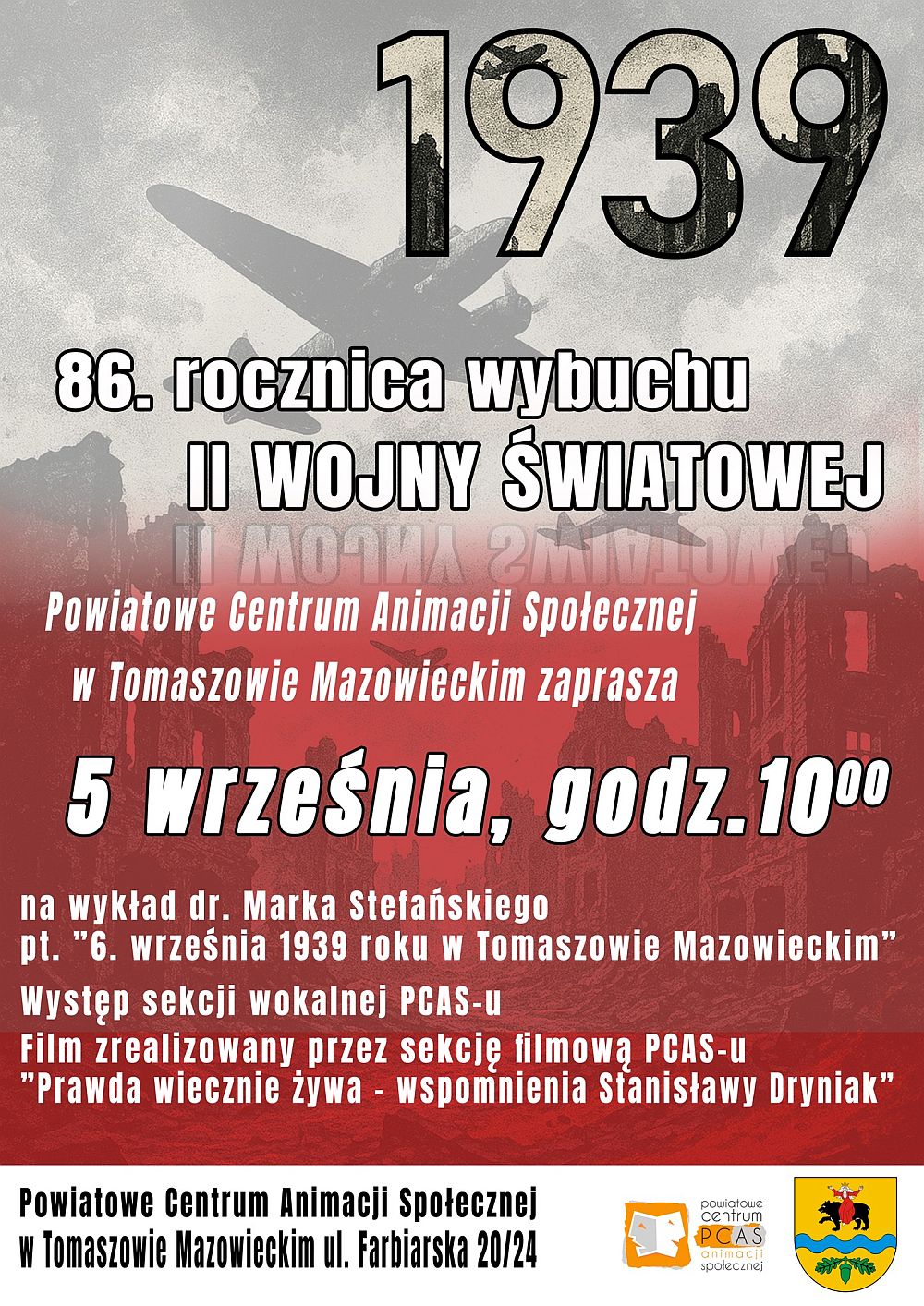 Z kolei w piątek, 5.09 tematyczne spotkanie odbędzie się w PCAS. Przewidziany jest wykład dr. Marka Stefańskiego, zatytułowany "6 września 1939 roku w Tomaszowie Mazowieckim", a poświęcony pierwszym walkom prowadzonym w ramach działań wojennych na ulicach naszego miasta. Będzie też występ sekcji wokalnej placówki z piosenkami patriotycznymi oraz pokaz filmu dokumentalnego, zrealizowanego przez tutejszą sekcję filmową pt. "Prawda wiecznie żywa – wspomnienia Stanisławy Dryniak" z zapisem rozmowy o tamtych dniach z tomaszowianką. Początek spotkania w sali widowiskowej PCAS przy ul. Farbiarskiej 20/24 o godz. 10.00. Wstęp wolny.