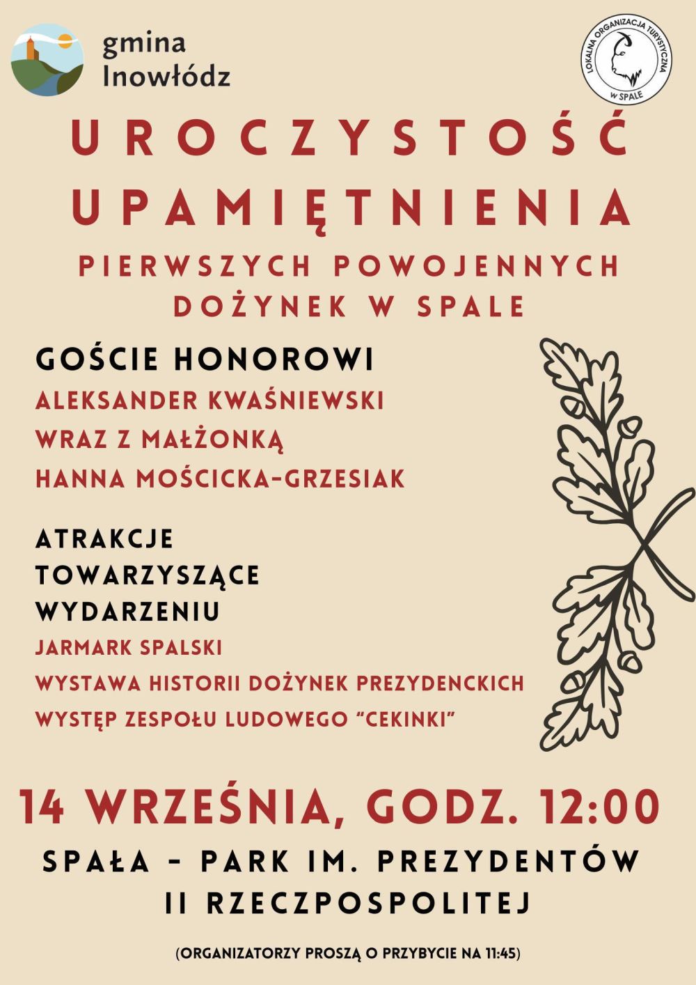 W części artystycznej wystąpi zespół "Cekinki". Będzie można również obejrzeć wystawę dotyczącą spalskich dożynek. Tego dnia odbędzie się też Spalski Jarmark Antyków i Rękodzieła Ludowego.