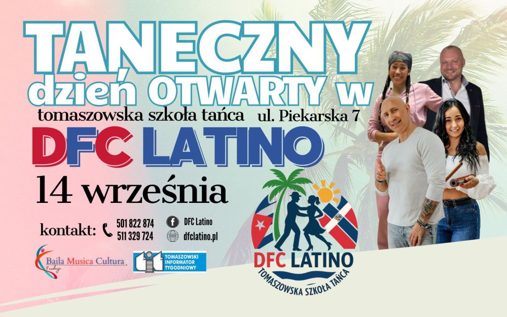 Okazja do tańca będzie i dzień później – w niedzielę, 14.09 w godzinach od 14.15 do 18.20, kiedy to DFC Latino organizuje dzień otwarty. W jego ramach w siedzibie szkoły przy ul. Piekarskiej 7 prowadzone mają być nieodpłatne pokazowe zajęcia w stylach: salsa (14.30 solo, 15.10 w parach), bachata (15.50 solo, 16.30 w parach), latino fit (17.10) oraz z tańca użytkowego (17.50).