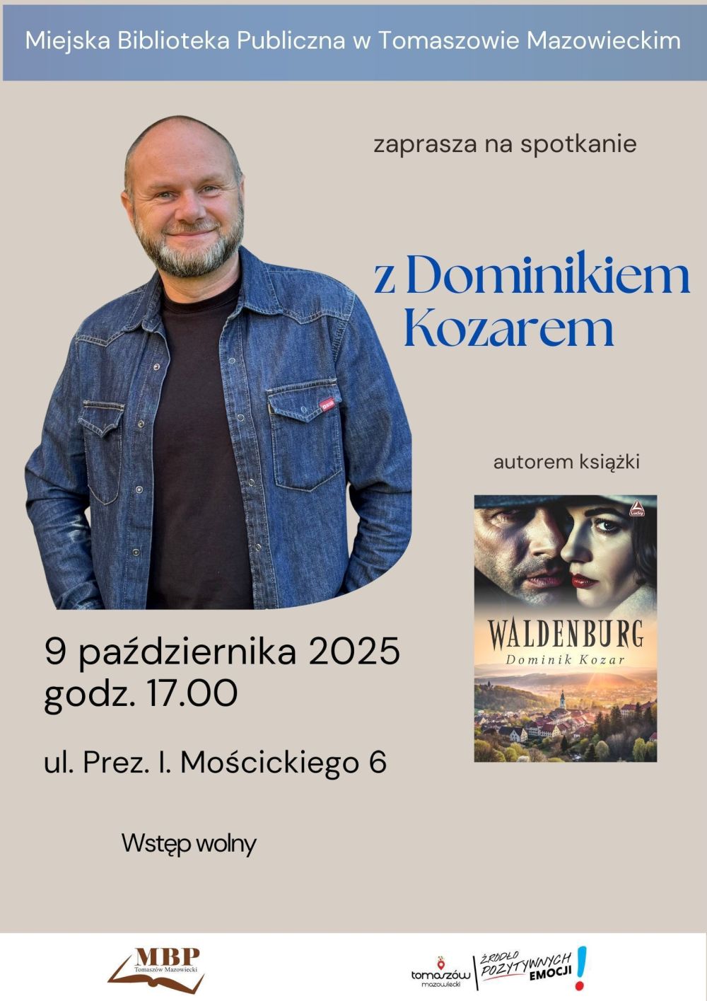 Dominik Kozar to absolwent Uniwersytetu Warszawskiego, z zawodu nauczyciel, a z zamiłowania pasjonat literatury, historii, pieszych wędrówek, od lat związany z Tomaszowem Mazowieckim. Autor trzech kryminałów: "Likwidator 44", "Wyklęty 48" oraz najnowszej powieści pt. "Waldenburg". – Spotkanie połączone będzie z promocją ostatniej książki autora. Zapraszamy, wstęp wolny – zachęca Anna Zwardoń, dyrektorka Miejskiej Biblioteki Publicznej w Tomaszowie.
