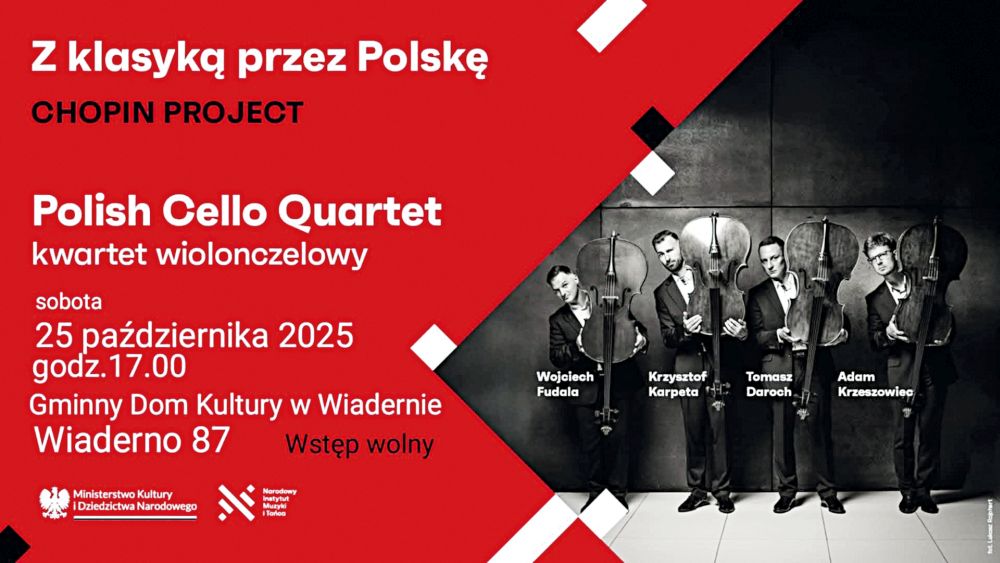 Tak wydarzenie zapowiadają organizatorzy z Centrum Kultury i Biblioteki Gminy Tomasów, zapraszając 25 października do Gminnego Domu Kultury w Wiadernie. Tego dnia zawita tam Polish Cello Quartet, który zaprezentuje publiczności transkrypcje mazurków, preludiów, etiud, nokturnów i walców Chopina na cztery wiolonczele.