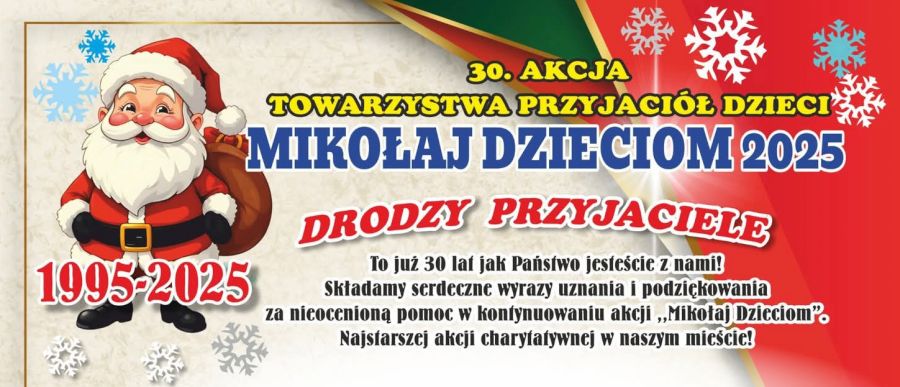 Już po raz 30. mieszkańcy naszego miasta i powiatu mogą być fundatorami upominków dla najmłodszych w ramach akcji "Mikołaj dzieciom" organizowanej przez powiatowy oddział Towarzystwa Przyjaciół Dzieci.