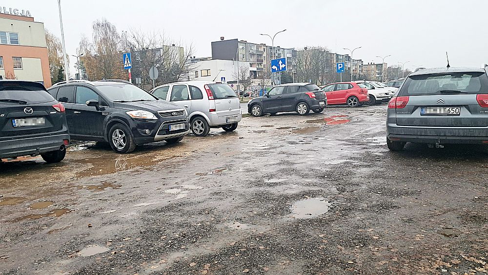 Policyjny, służbowy parking znajduje się przy budynku komendy, jednak ten, z którego korzystają pracownicy i interesanci, jest po drugiej stronie ulicy Wandy Panfil. Od dawna jest w złym stanie, choć odbywały się tam nawet różne policyjne, powiatowe wydarzenia, jak np. Święto Policji. Już wówczas, około 10 lat temu, nawierzchnia pozostawiała wiele do życzenia. Ciężko się chodziło po wysypanym żwirze. Obecnie jest jeszcze gorzej – parking jest podziurawiony jak szwajcarski ser. W dużych dziurach po deszczach zbiera się woda. – Ostatnio załatwiałam pewną sprawę na komendzie. Skręciłam na parking, ale bałam się, że zniszczę auto, tak jest zrujnowany i dziurawy – mówi jedna z czytelniczek. – Ostatecznie udało mi się jakoś powoli wjechać. Potem o mało nie poślizgnęłam się na błocie – zauważa.