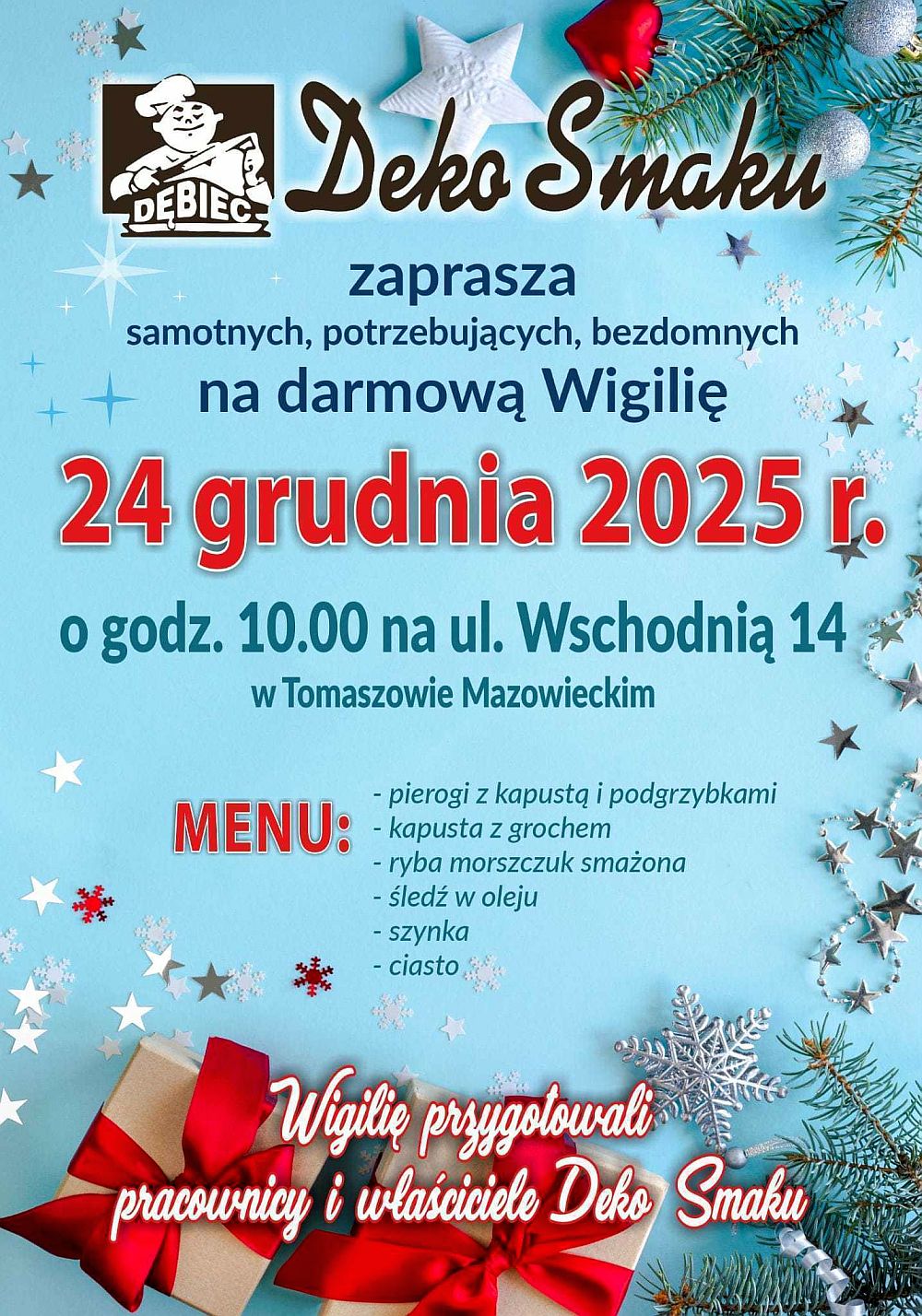 Jak co roku właściciele Deko Smaku organizują bezpłatną wigilię dla osób bezdomnych, samotnych, potrzebujących. Odbędzie się 24 grudnia o godz. 10.00 przed ich sklepem na ul. Wschodniej 14.