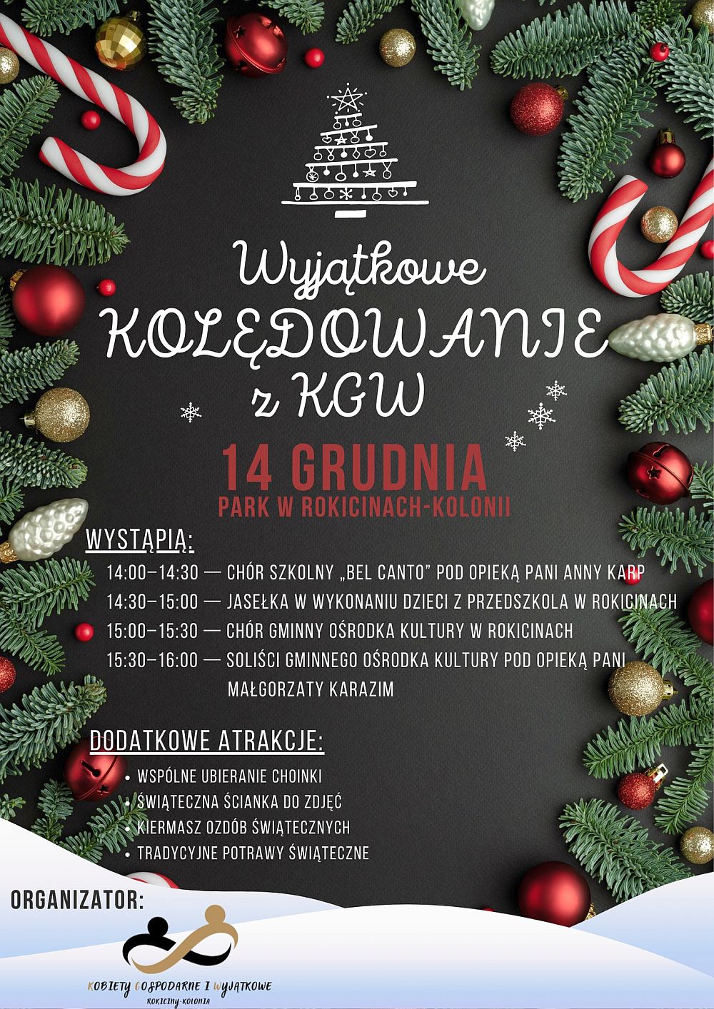 Początek o godz. 14.00. Na scenie w miejscowym parku zaprezentują się: chór szkolny "Bel Canto" pod kierunkiem Anny Karp (14.00–14.30) oraz chór Gminnego Ośrodka Kultury w Rokicinach (15.00–15.30) i jego soliści pod opieką Małgorzaty Karazim (15.30–16.00). Będą również jasełka w wykonaniu dzieci z przedszkola w Rokicinach (14.30–15.00). W programie przewidziane są także kiermasz ozdób świątecznych i wspólne ubieranie choinki. Można będzie skosztować tradycyjnych potraw świątecznych oraz zrobić pamiątkowe zdjęcia na tle tematycznej ścianki.