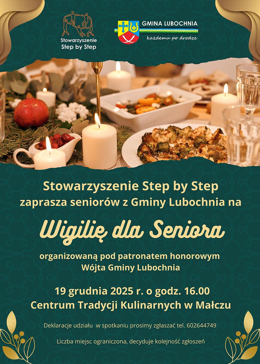 W Centrum Tradycji Kulinarnych w Małczu będą mogli podzielić się opłatkiem, skosztować świątecznych potraw i wspólnie śpiewać kolędy. Organizatorem wydarzenia jest lubocheńskie Stowarzyszenie "Step by Step" przy współpracy ze Stowarzyszeniem Rozwoju Małcza "Różanecznik". Honorowy patronat nad nim objął wójt Piotr Majchrowski. Z uwagi na ograniczoną liczbę miejsc o udziale decydować będzie kolejność zgłoszeń. Te przyjmowane są telefonicznie pod numerem 602-644-749.