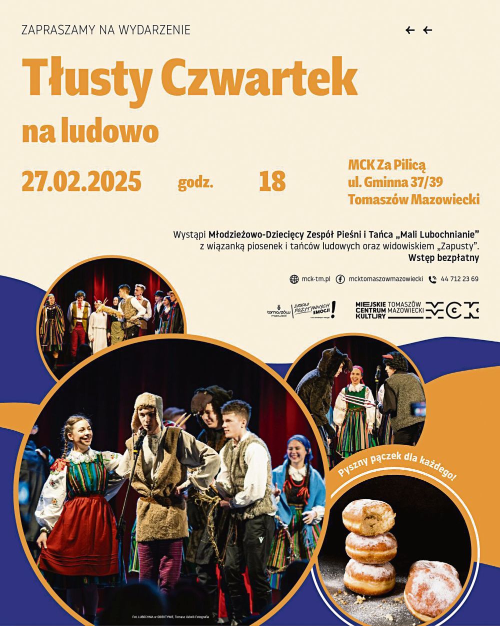 W Miejskim Centrum Kultury Za Pilicą odbędzie się impreza pn. "Tłusty Czwartek na ludowo" z koncertem i poczęstunkiem. Wydarzenie zaplanowano na 27 lutego na godz. 18.