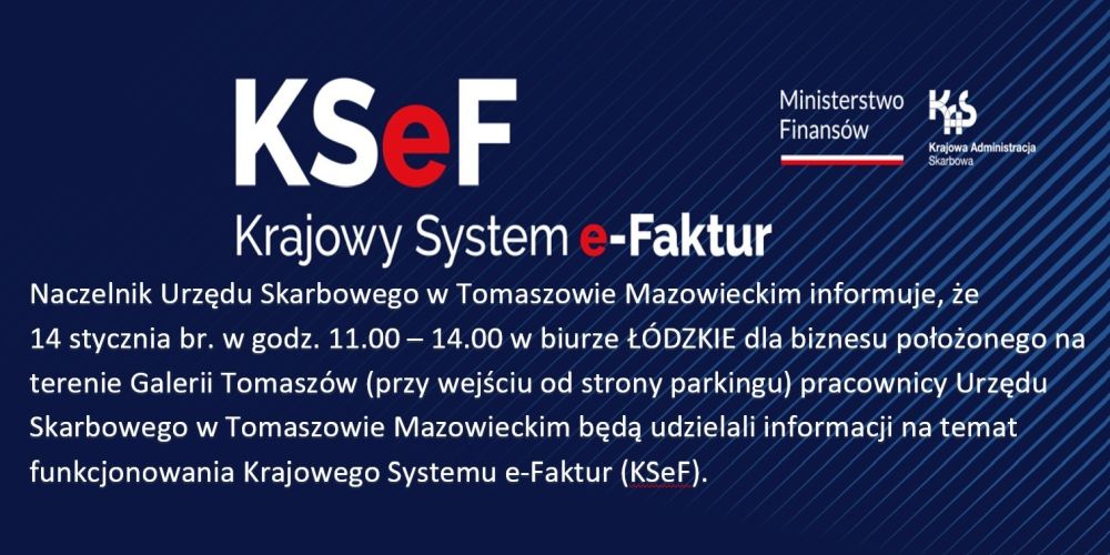 14 stycznia w godz. 11.00–14.00 w biurze Łódzkie dla biznesu położonego na terenie Galerii Tomaszów (przy wejściu od strony parkingu) pracownicy Urzędu Skarbowego w Tomaszowie Mazowieckim będą udzielali informacji na temat funkcjonowania Krajowego Systemu e-Faktur (KSeF).