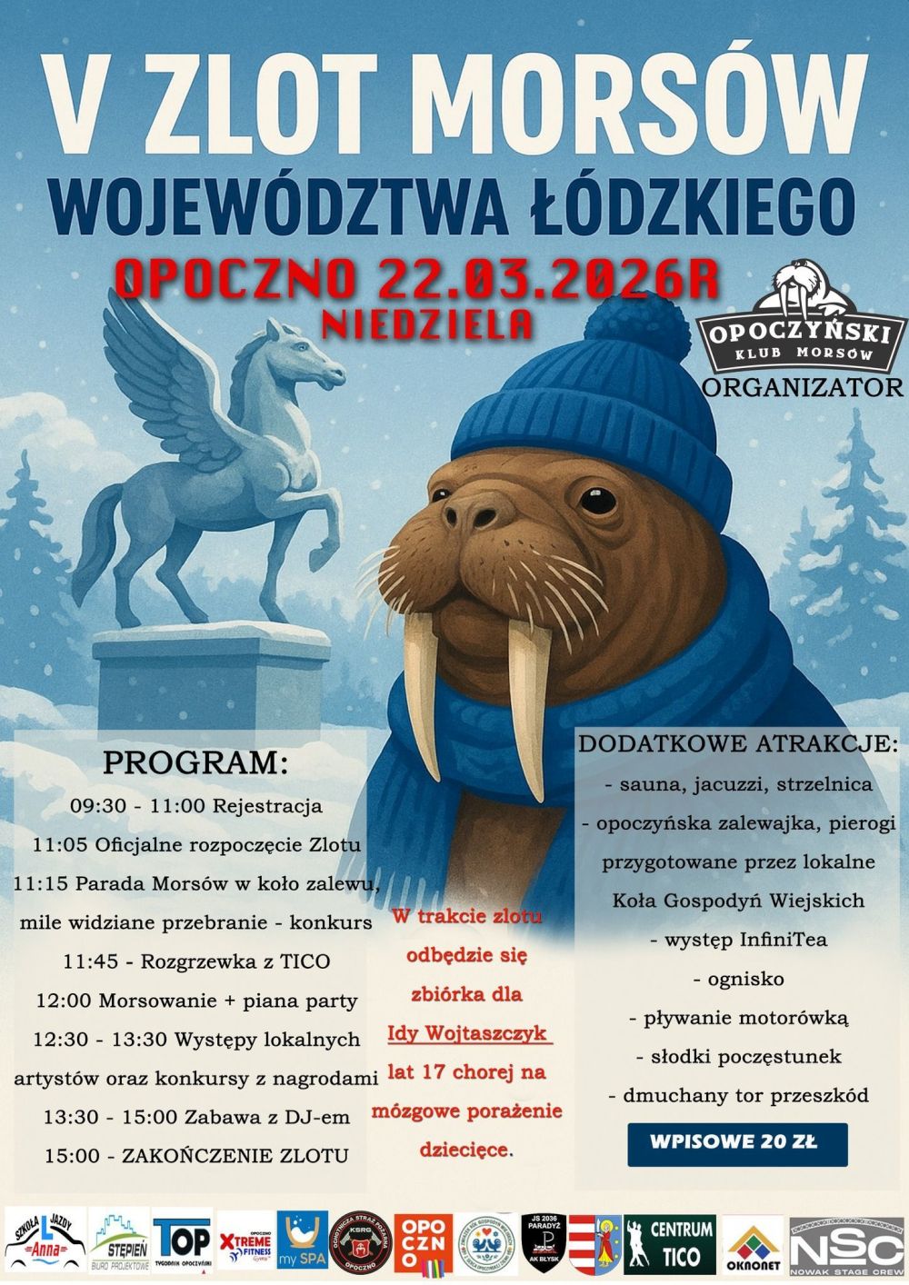 W trakcie imprezy odbędą się zawody, gry i zabawy, w których uczestniczyć będą członkowie licznych klubów morsów nie tylko z naszego województwa. Będzie można spróbować opoczyńskiej zalewajki i pierogów przygotowanych przez KGW, a także pajdy chleba ze smalcem i kiszonym ogórkiem. Ci, którzy mają chęć spróbowania kąpieli w zimnej (choć już nie tak bardzo) wodzie, będą mogli zrobić to w doborowym towarzystwie, ale nie jest to konieczne.