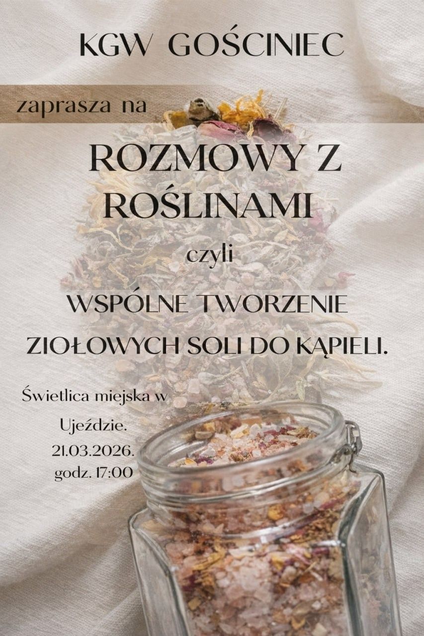 Pierwszego dnia kalendarzowej wiosny – w sobotę, 21 marca – organizuje dwugodzinne warsztaty z tworzenia ziołowych soli do kąpieli. Uczestnicy mają zapewnione przekąski i herbatę. Spotkanie odbędzie się w świetlicy miejskiej w Ujeździe przy ul. Kościelnej 24. Początek przewidziany jest na godzinę 17.00. Z uwagi na ograniczoną liczbę miejsc, obowiązują zapisy. Przyjmowane są telefonicznie pod numerem 513-375-967.
