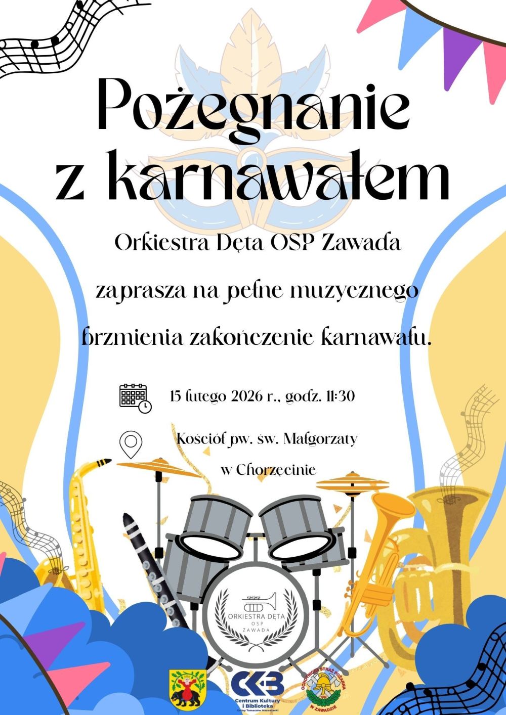 Na muzyczne "Pożegnanie z karnawałem" zaprasza Orkiestra Dęta Ochotniczej Straży Pożarnej w Zawadzie. Koncert odbędzie się 15 lutego w kościele pw. św. Małgorzaty w Chorzęcinie. Początek o godz.11.30. W repertuarze muzyka filmowa i rozrywkowa.