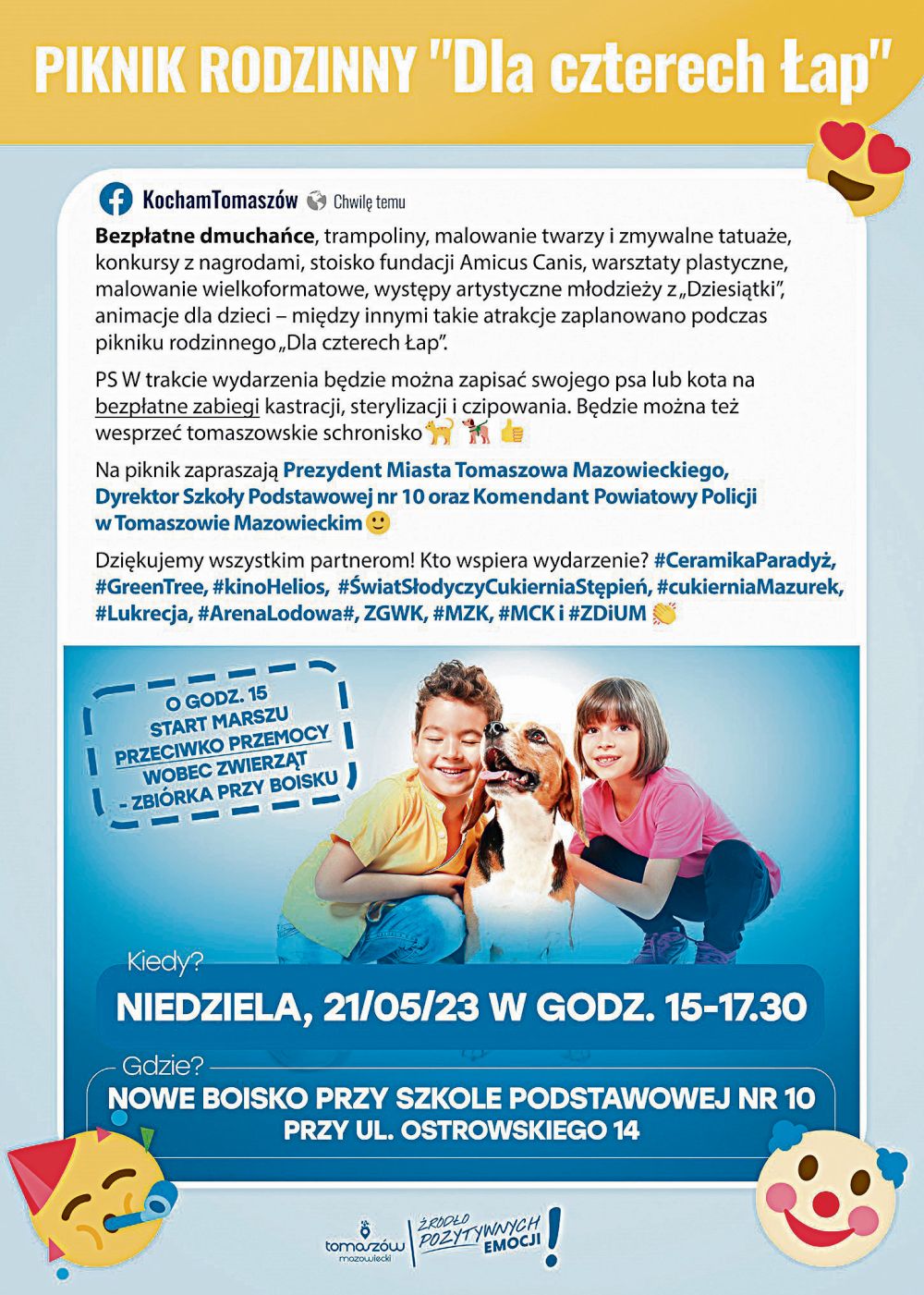 Marsz rozpocznie się o godz. 15.00. - Zapraszamy na zbiórkę przy boisku SP nr 10 - mówi Joanna Budny, rzeczniczka prasowa tomaszowskiego Urzędu Miasta. Podczas pikniku będzie sporo bezpłatnych atrakcji, takich jak: malowanie twarzy, dmuchańce, zmywalne tatuaże, trampoliny, konkursy z nagrodami, animacje dla najmłodszych, występy artystyczne dzieci z SP nr 10 oraz stoisko fundacji Amicus Canis. Na piknik zapraszają: prezydent Tomaszowa Marcin Witko, dyrektor SP 10 Piotr Chomentowski oraz komendant KPP mł. insp. Tomasz Jędrzejczyk.
