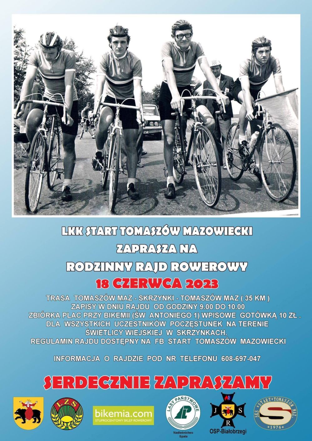 Ludowy Klub Kolarski Start Tomaszów Mazowiecki organizuje w niedzielę, 18 czerwca Rodzinny rajd rowerowy. Do przejechania będzie 35 km na trasie: Tomaszów Maz. - Skrzynki - Tomaszów Maz. Miejscem zbiórki jest plac przy Bikemii przy ul. św. Antoniego 1 i tam też w godz. 9.00-10.00 przyjmowane będą zapisy. Wpisowe wynosi 10 zł, płatne gotówką.