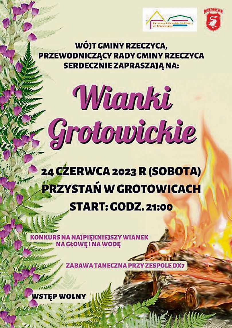 W sobotę, 24 czerwca wianki popłyną Pilicą także z przystani kajakowej w Grotowicach. Wcześniej jednak rozstrzygnięty zostanie konkurs na te najpiękniejsze - i na wodę, i na głowę. A gdy już spłyną z nurtem rzeki, nad jej brzegiem zapłonie ogromne ognisko i rozpocznie się zabawa taneczna przy akompaniamencie zespołu DX7. Początek imprezy zaplanowany jest na godz. 21.00.