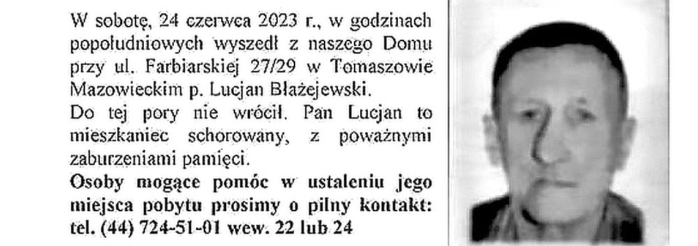 W sobotę, 24 czerwca 2023 roku pan Lucjan Błażejewski wyszedł w godzinach popołudniowych z Domu Pomocy Społecznej przy ul. Farbiarskiej 27/29 w Tomaszowie Mazowieckim.
