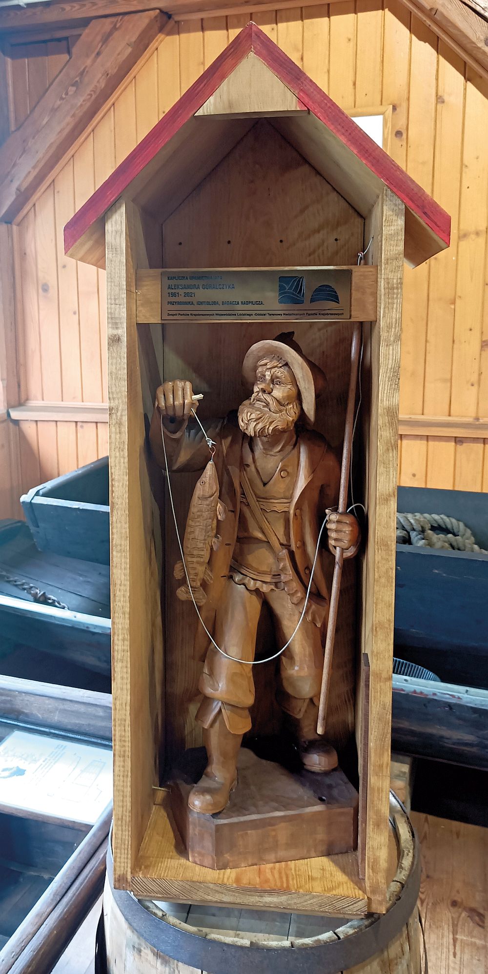 Obecnie ten niewielki obiekt stoi w skansenowej świetlicy. Ale docelowo będzie umieszczony na zewnątrz. Inicjatywa takiego upamiętnienia wyszła z zespołu Nadpilicznych Parków Krajobrazowych, a personalnie od Zbigniewa Kołudzkiego, który był projektantem i wykonawcą rzeźby.