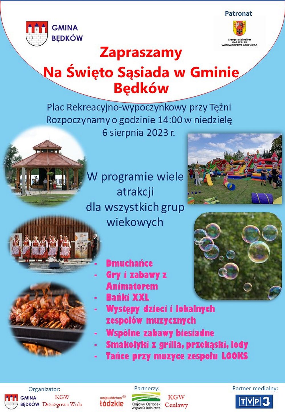 Będą gry i zabawy z animatorem, bańki XXL i dmuchańce, występy dzieci i lokalnych zespołów muzycznych, wspólne zabawy biesiadne i tańce przy muzyce grupy LOOKS, a także smakołyki z grilla, przekąski i lody. Organizatorem, obok gminy, jest Koło Gospodyń Wiejskich z Drzazgowej Woli przy współpracy z KGW Ceniawy, Krajowym Ośrodkiem Wsparcia Rolnictwa i Samorządem Województwa Łódzkiego.
