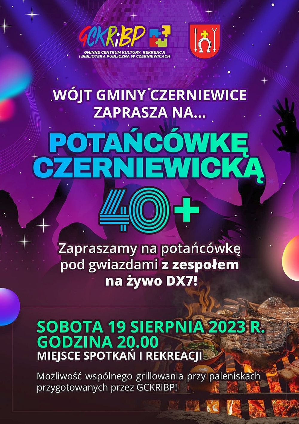 "Potańcówka czerniewicka 40+" zaplanowana jest na sobotę, 19 sierpnia od godz. 20.00 w miejscu spotkań i rekreacji w Czerniewicach.