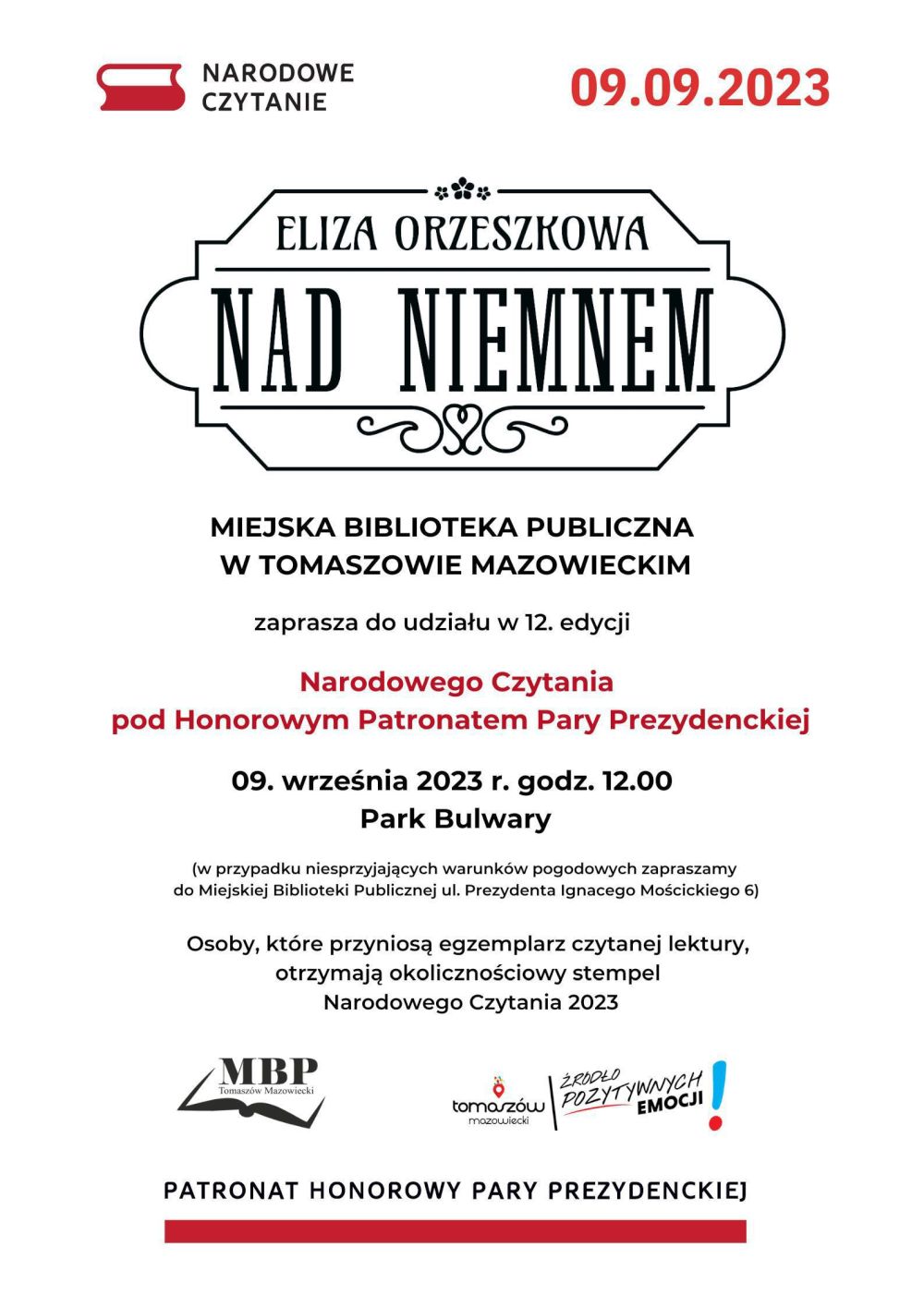 Na lekturę 12. odsłony przedsięwzięcia wybrano "Nad Niemnem", książkę, która ukazała się w 1888 r. i uchodzi za najwybitniejszą powieść Elizy Orzeszkowej. Do Narodowego Czytania, tak jak w latach ubiegłych, włącza się tomaszowska biblioteka. Osoby, które przyniosą egzemplarz czytanej lektury, otrzymają okolicznościowy stempel Narodowego Czytania 2023.