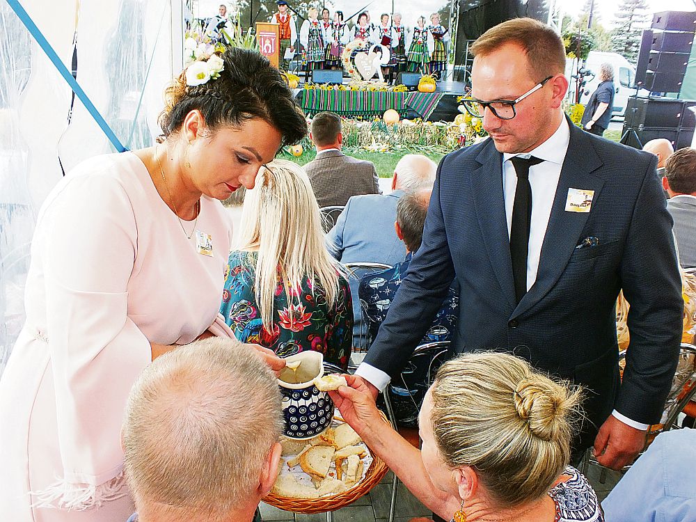"Pierwszy gospodarz" gminy wspólnie z przewodniczącym RG pokroili chleb dożynkowy na małe kawałki, którymi starostwie i panie z KGW częstowali uczestników niedzielnej ceremonii.