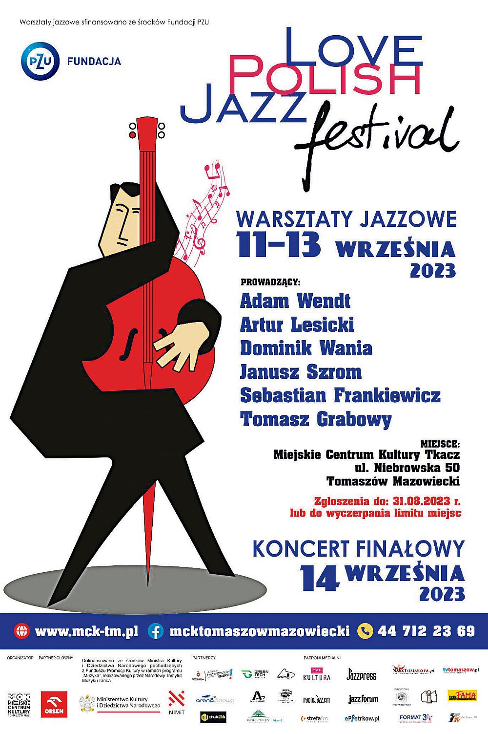 Główna impreza rozpocznie się w Arenie Lodowej 15 września o godz. 18. Wystąpią: TM Brass Orchestra pod kierunkiem Kamila Wrony - Jazz Standards and Greatest Hits (premiera); Maciej Tubis Komeda: Reflections; Włodek Pawlik Trio. W sobotę, 16 września od godz. 18 można tam będzie posłuchać takich artystów jak: Maciej Smoluch Flamenco Passion 2023! (prapremiera); Adam Makowicz Welcome Back, Adam; Aga Zaryan Trio Polskie evergreeny (premiera). W niedzielę, 17 września od godz. 18 na scenie Areny Lodowej zaprezentują się: Funky Bomba Trio Collective Project Young Cats: Mateusz Tomiak/Kosma Góra/Kacper Kaczyński; Adam Bałdych Quintet Inspired by Komeda (premiera); oraz Justyna Steczkowska Największe przeboje na jazzowo (premiera). Bilety można zakupić drogą online przez Biletyna.pl https://biletyna.pl/festiwal/Love-Polish-Jazz-Festival/Tomaszow-Mazowiecki, a także stacjonarnie u organizatora, którym jest MCK. Dla posiadaczy Karty Tomaszowianina (za jej okazaniem) przy zakupie biletu stacjonarnie zniżki.
