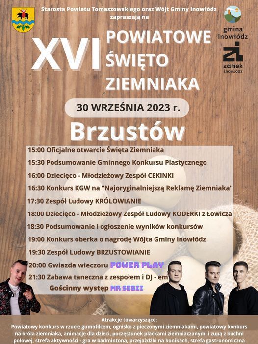 Będą oczywiście i występy: Dziecięco-Młodzieżowego Zespołu "Cekinki" (16.00), Zespołu Ludowego "Królowianie" (17.30), Dziecięco-Młodzieżowego Zespołu Ludowego "Koderki" z Łowicza (18.00), Zespołu Ludowego "Brzustowianie" (19.30) oraz, jako gwiazdy wieczoru, grupy disco polo i dance Power Play (20.00). Później jeszcze zabawa taneczna z zespołem i didżejem oraz gościnnym występem Mr Sebii (od 21.30). Nie zabraknie animacji dla dzieci i strefy aktywności z grą w badmintona i przejażdżkami na konikach. Uczestnicy częstowani będą plackami ziemniaczanymi i zupą z kuchni polowej oraz pieczonymi ziemniakami z ogniska, zaś na tych, którzy nie poczują się po nich syci, czekać ma strefa gastronomiczna.