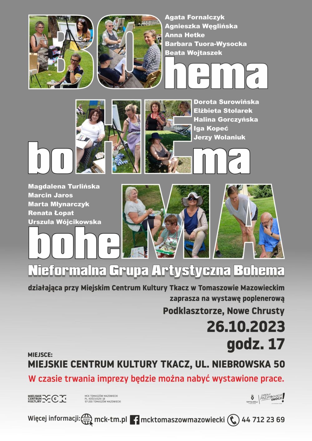 Bohema działa w Miejskim Centrum Kultury w Tomaszowie Mazowieckim, tworzą ją uczestnicy zajęć rysunku i malarstwa pod kierunkiem artysty plastyka Mirosława Bernackiego. Na wystawie w macierzystym Tkaczu pokaże prace powstałe podczas dwóch plenerów. Wzięli w nich udział: Agata Fornalczyk, Halina Gorczyńska, Anna Hetke, Marcin Jaros, Iga Kopeć, Renata Łopat, Marta Młynarczyk, Elżbieta Stolarek, Dorota Surowińska, Barbara Tuora-Wysocka, Magdalena Turlińska, Agnieszka Węglińska, Beata Wojtaszek, Jerzy Wolaniuk i Urszula Wójcikowska.