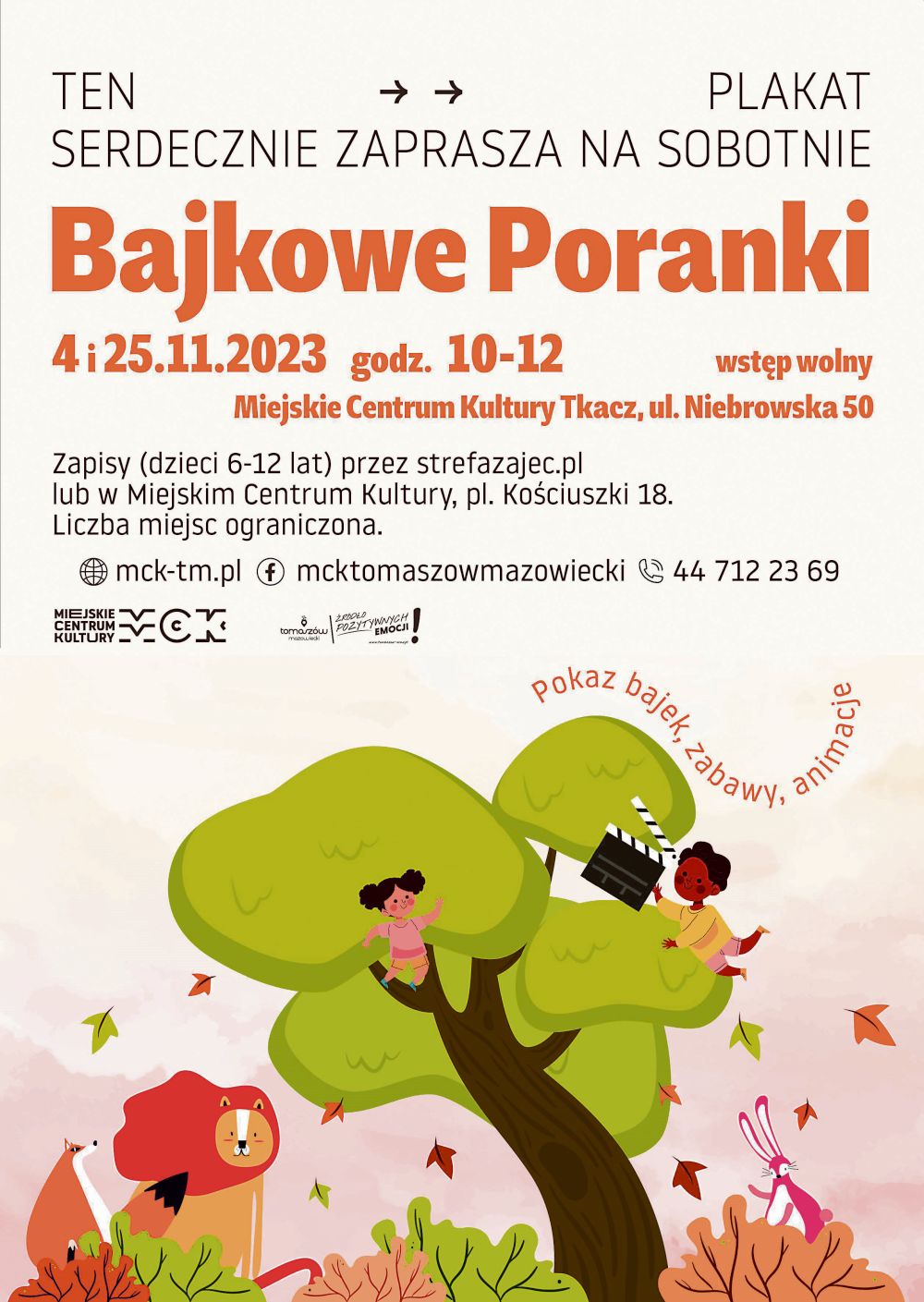 Pokazy filmowe poprzedzane miniwarsztatami, zabawami i animacjami dla dzieci w wieku 6-12 lat, organizowane przez Miejskie Centrum Kultury w Tomaszowie Mazowieckim, w listopadzie odbędą się w soboty - najbliższą 4 oraz 25.