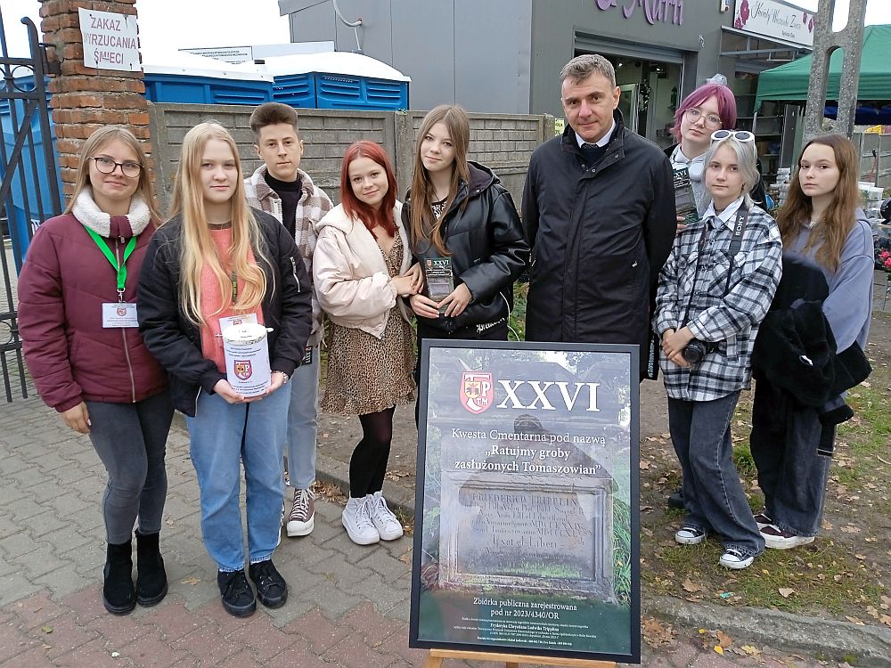 Jak co roku przy wejściach na cmentarze spotkaliśmy starszych i młodszych, znanych i mniej znanych tomaszowian zbierających pieniądze na odnowienie zabytkowych nagrobków.