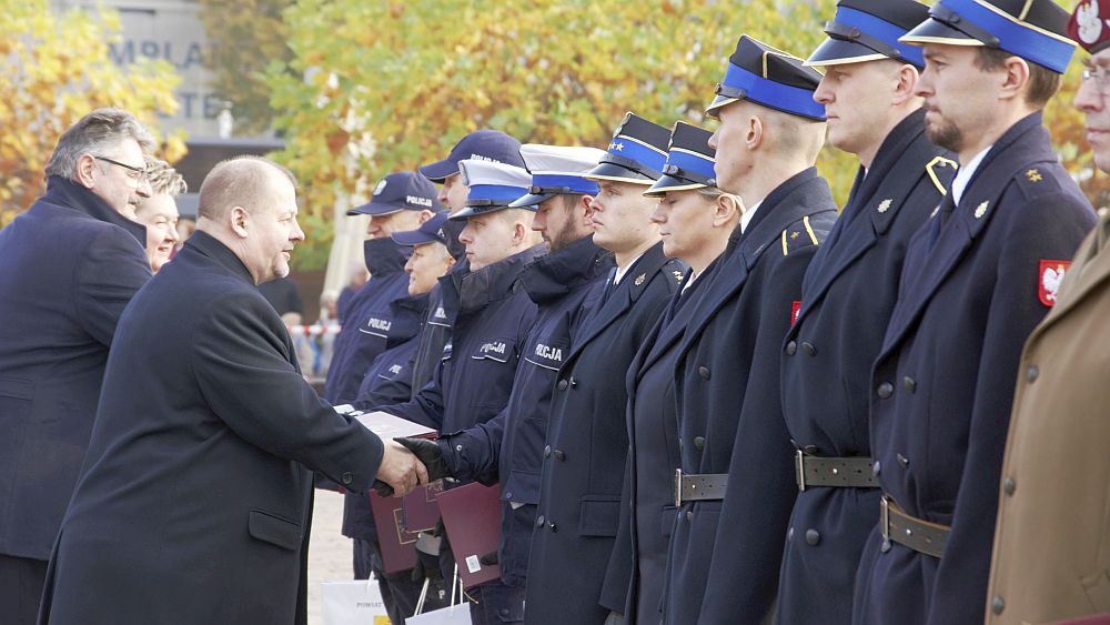 Uroczystość niepodległościowa była okazją do wyróżnienia żołnierzy 25. Brygady Kawalerii Powietrznej, policjantów z Komendy Powiatowej Policji, strażaków z Komendy Powiatowej Państwowej Straży Pożarnej. Nagrodzone osoby wystąpiły na środek płyty pl. Kościuszki. Gratulowali im. m.in. starosta, prezydent Tomaszowa i dowódca kawalerzystów. Żołnierze oddali salwę honorową. Potem można było posłuchać m.in. pieśni reprezentacyjnej Wojska Polskiego i zobaczyć defiladę pododdziałów. Znamienne jest to, że choć na uroczystości przyszło wiele osób, w tym dzieci ze szkół i przedszkoli z nauczycielami, osoby z różnych organizacji pozarządowych i całe rodziny, brakowało elementów biało-czerwonych: okolicznościowych chorągiewek, balonów, biało-czerwonych strojów czy w ogóle osób z flagami. Co warto podkreślić, uroczystość wreszcie wolna była od agitacji wyborczej (wszak już po wyborach parlamentarnych) i dzięki temu nie była zbędnie przedłużona o kolejne przemowy. Osobom, które przed wyborami można było spotkać niemal na każdym, nawet niewielkim wydarzeniu, nagle przestało już jak widać zależeć na "brylowaniu" wśród mieszkańców i zwyczajnie się na obchodach 11 listopada w naszym mieście nie pojawiły.