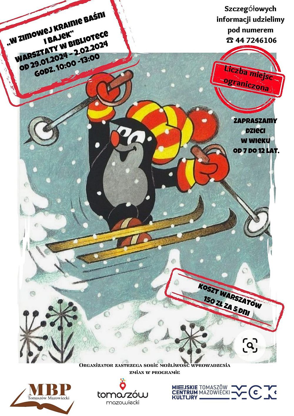 Oddział dla Dzieci i Młodzieży Miejskiej Biblioteki Publicznej proponuje dzieciom w wieku od 7 do 12 lat udział w zimowych warsztatach pt. "W zimowej krainie baśni i bajek".