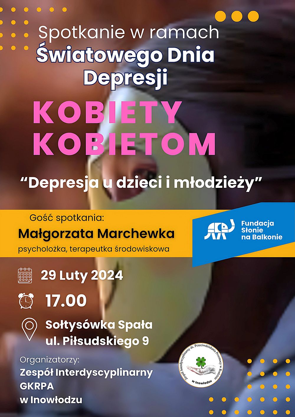 Poświęcone zostanie problemowi tej choroby wśród dzieci i młodzieży. Prowadzącą będzie psycholożka i terapeutka środowiskowa Małgorzata Marchewka z łódzkiej Fundacji Słonie na Balkonie.