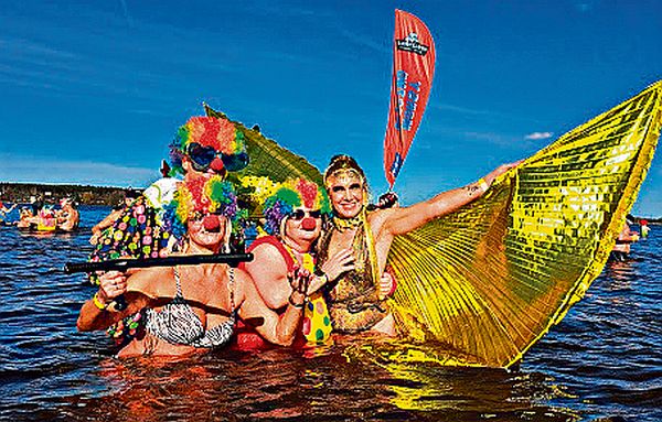 Przyjechały setki osób z całej Polski, które korzystały nie tylko z kąpieli słonecznych. Radośni, poprzebierani (w stroje cyrkowe), nikomu nie było zimno.