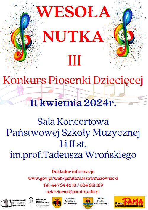 Państwowa Szkoła Muzyczna I i II st. im. prof. Tadeusza Wrońskiego w Tomaszowie Mazowieckim po raz trzeci jest organizatorką powiatowego Konkursu Piosenki Dziecięcej pod hasłem "Wesoła nutka". Zgłoszenia przyjmowane są do 5 kwietnia.