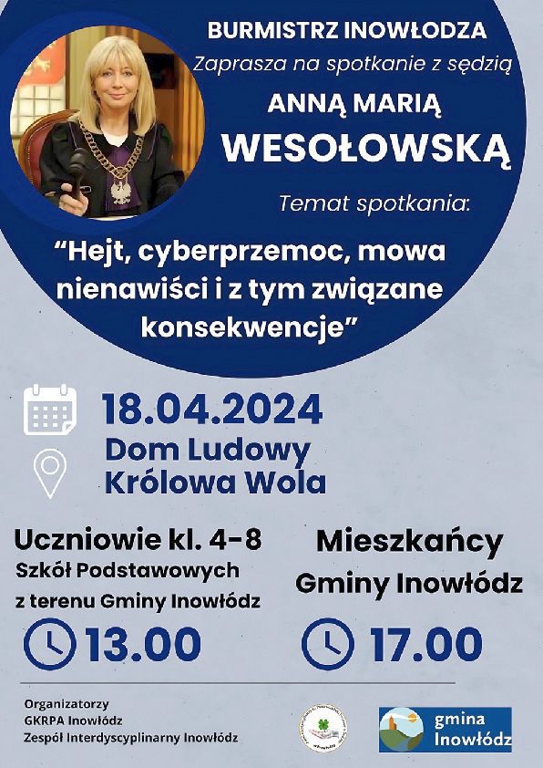 W tamtejszym Domu Ludowym zorganizowane zostaną z nią dwa spotkania pt. "Hejt, cyberprzemoc, mowa nienawiści i z tym związane konsekwencje". O godz. 13.00 dla uczniów klas IV-VIII, a o godz. 17.00 dla wszystkich mieszkańców.